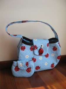 What a fun little project for my nieces! I designed a cute little purse for their birthdays. It was made from ladybug cotton quilting fabric. The girls loved them! Here are a few pics which show how simple it was to put together…