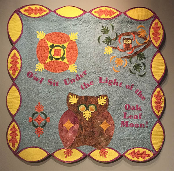 1. Lori’s Art Quilt, “O’wl Sit Under the Light of the Oak Leaf Moon” was a finalist in the yearly National Quilt Museum contest, “New Quilt from an Old Favorite.” Lori’s quilt hung in that Exhibit at the National Quilt Museum from April through June of 2019 and travelled with the Exhibit around the country until December of 2020.