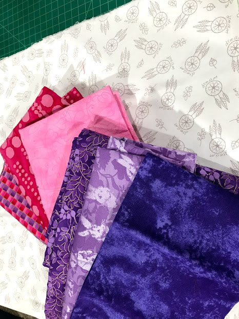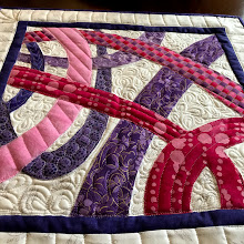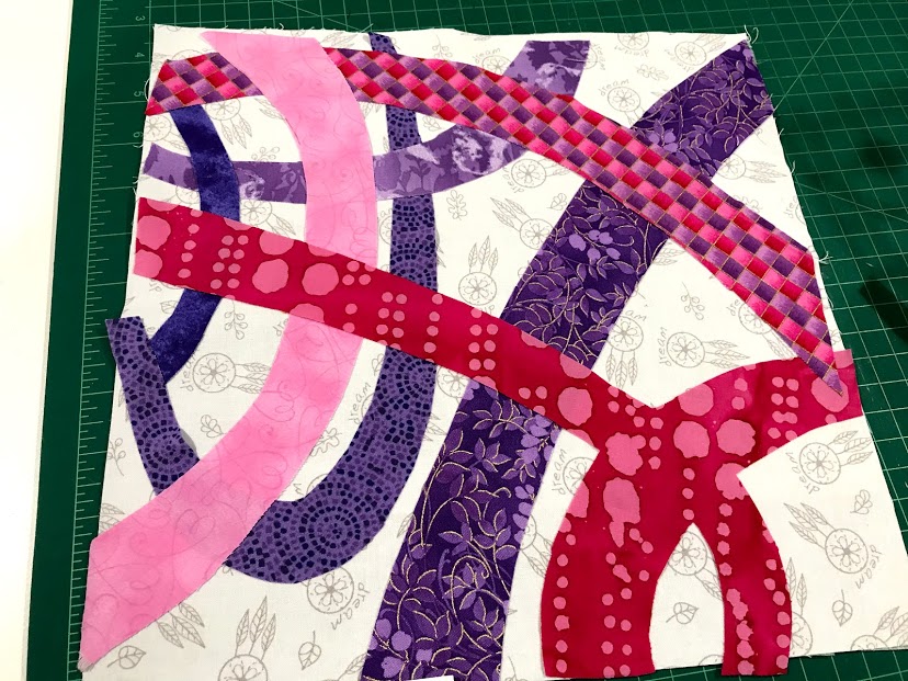Embroidery threads of various shades of pink and purple were used to applique the quilt pieces onto the background. I simply used an ‘edge’ stitch to applique all the pieces to the background.