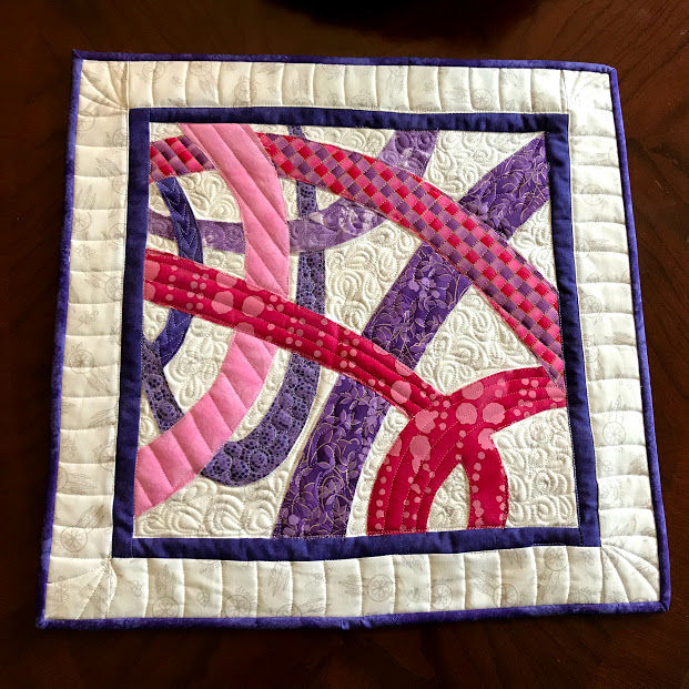 Once the elements of the art quilt were appliqued to the background, then I added a small purple border for accent, along with a 2″ outer border. At this point I took the little quilt to my long-arm quilt machine. The background was quilted with a free-motion paisley quilt stitch, and the individual elements were each quilted using a different free-motion quilt stitch. The outer border was quilted using a ‘curved’ edge ruler…I wanted to motion of the quilt to continue out on the border to some degree.