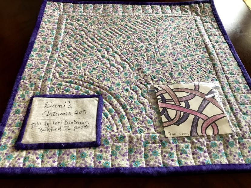 The binding for the quilt uses the same purple fabric as the inner border, When I attached the label, I also decided to attach Dani’s original artwork to the back of the quilt. I encased it in a sandwich bag and simply hand-stitched it to the back of the quilt. It will be a visual reference of Dani’s art for years to come.