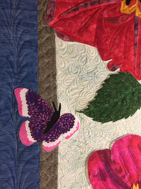 Below are pics of a few closeups of the Quilt… The technique used is applique using Steam-A-Seam 2. I used matching or complimentary Embroidery thread to applique the various pieces to the background. You’ll notice some of the flowers and the butterflies were appliqued ‘peeking’ out of the ‘window’ onto the border of the quilt. I used a paisley free motion quilting stitch (using my longarm) for the background and a free motion feather stitch around the outer blue border.