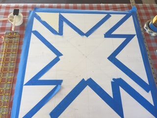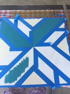 Suzi provided completely “primed” 24″ x 24″ boards (1/4″ thick), along with the paint (exterior latex) and sponge brushes. We brought our yard sticks, pencils, painters tape and hair dryers! The process began by choosing the quilt block we wanted to paint on our 24″ board, then measuring out that particular block on our primed board (dividing the board according to the number of squares, etc). Then, we applied painters tape to the “correct” (and that is an important word!) area of the block in order to begin painting the background colors (lightest colors first). After each color dried (hence the blow dryers!), we were on to the next color!
