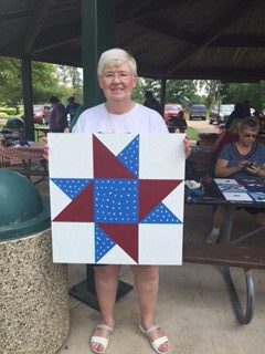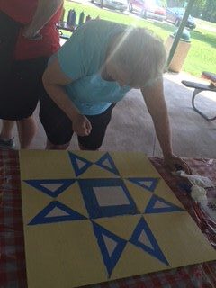 Suzi Parron, co-author of Barn Quilts Across America, (www.barnquiltinfo.com) had given our Guild a very informative lecture the evening before (Thursday, June 23rd). Needless to say, we had a very excited group of ladies that arrived at the Sycamore Park District on Friday morning to begin our venture of Barn Quilt Painting!