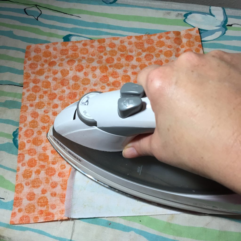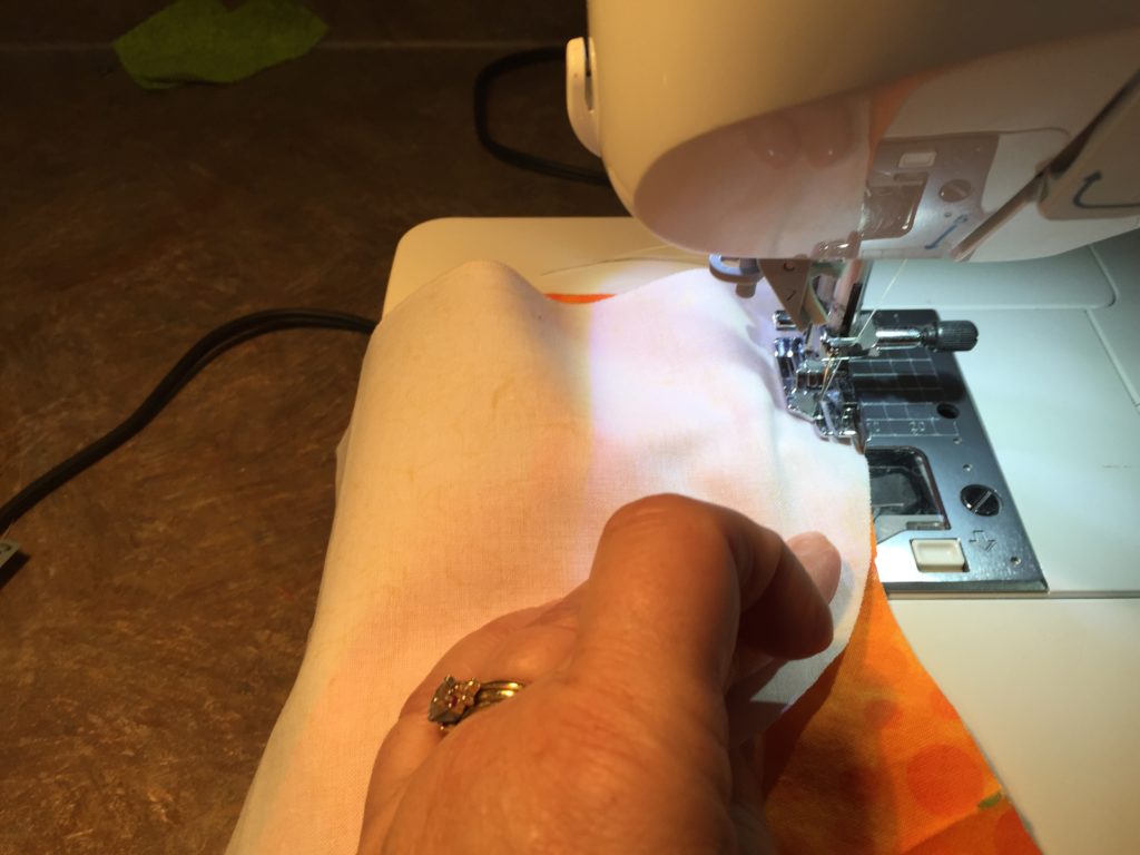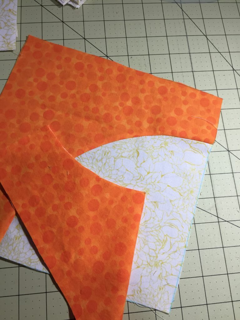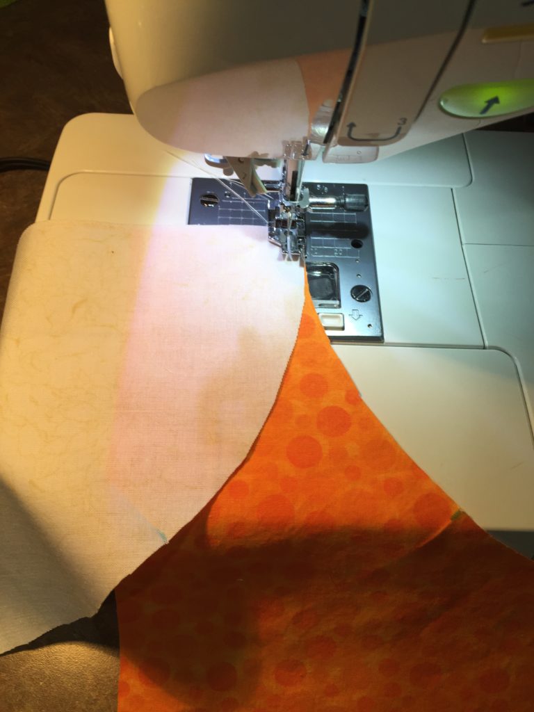 Now to begin sewing the curve: line up the white and orange pieces as shown below…. You will begin to stitch a few stitches from the top straight edge down the curve at a 1/4″ seam allowance. Only stitch a few stitches, then stop and slowly bring both sections together as you continue stitching down the 1/4″ seam allowance, matching the pressed creases on the white and orange sections.