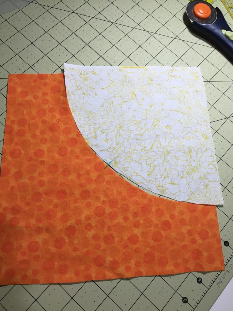 Below, you will see that the 2 pieces will be sewn together on that curve. It appears that the white section is larger than the orange section, but, It Is NOT! Once you take into account the 1/4″ seam allowances, the pieces will fit together perfectly!