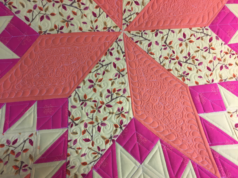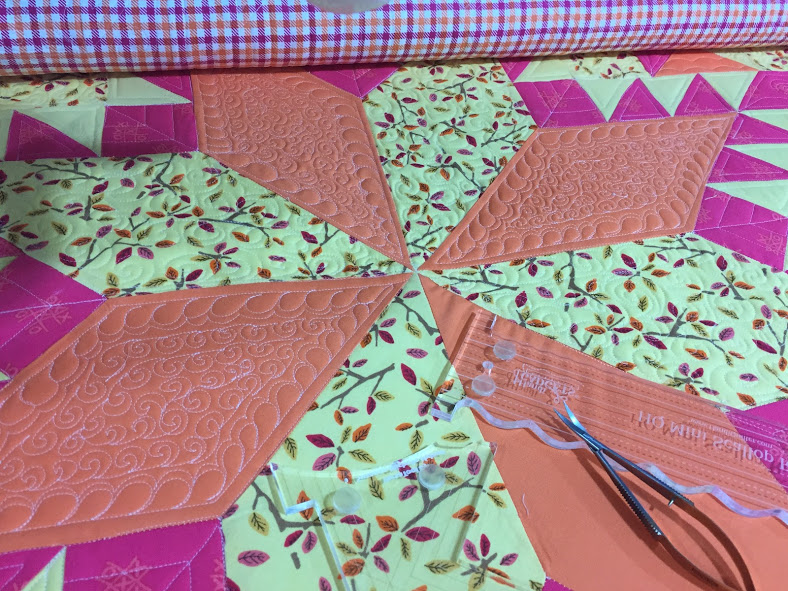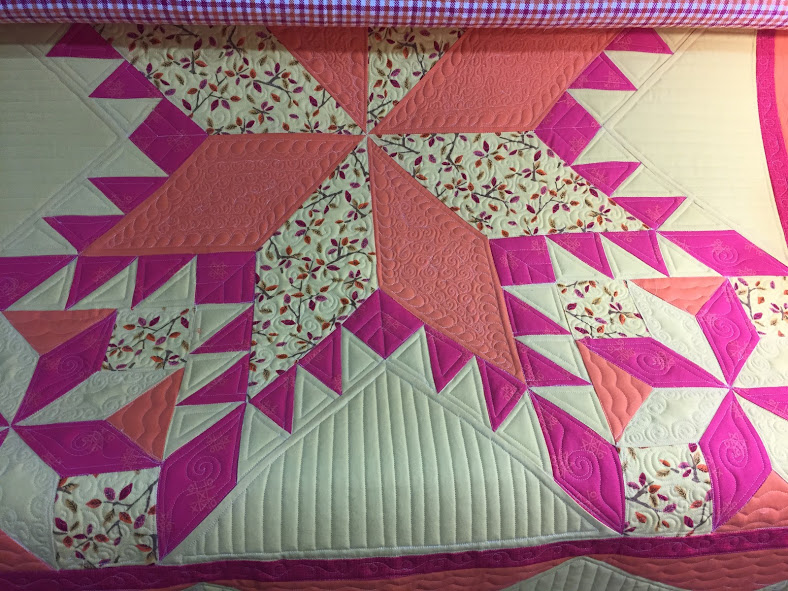 I did a lot of ruler work on the long-arm as I quilted the quilt. I also used a lot of Free Motion Quilting… Free Motion Quilting is kind of like using the long arm machine as my “pencil” as I “draw” across the quilt. It’s a lot of fun.
