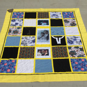 A customer requested a “yellow” quilt for her mother for Mother’s Day last year. She gave me three blocks which had family photos printed on them. She also gave me some fabrics from her grandmother’s clothing as well as themed fabric she purchased to include in the quilt. Yellow is her mother’s favorite color; hence the border and sashing is bright yellow fabric! (Note: the dark round item on the left corner of the quilt in the photo is a rock to keep the wind from moving the quilt while taking the photo!!) Notice the black and white block in the quilt: it is the neckline placket of a favorite top that was worn by the customer’s grandmother… I like to incorporate favorite pieces of clothing in Memory Quilts!