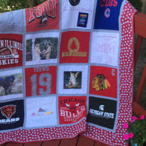 I’ve been making Memory quilts for customers for years…probably have made 25 to 30 of them in the last decade! They make great gifts for kids going off to college, wedding gifts, anniversary gifts, baby gifts, and of course, gifts to the family in memory of a loved one who passed away. The T-shirt quilt was one that I made for a dentist who has asked me to make numerous Memory Quilts for his children and grand-children over the years. He collects their t-shirts, or he’ll purchase t-shirts and memorabilia, and give those items to me to include in the memory quilts I’ve made for his family.