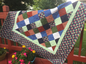 Last summer I made a Picnic Quilt for a newly married couple on staff at our church. I included a picnic basket as part of the gift. For this quilt, I used a Missouri Star quilt Tutorial pattern. It is a Charm quilt pattern, which is set on point…fast and fun to make.
