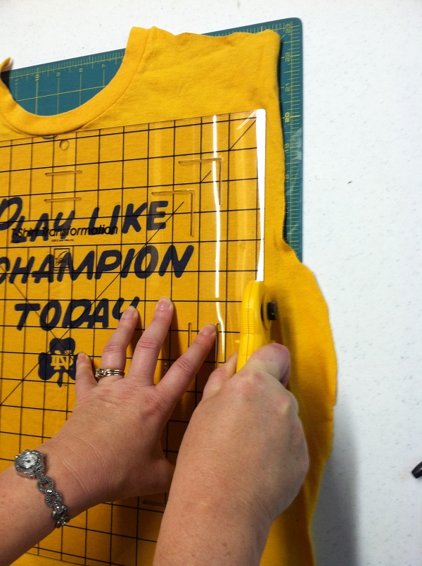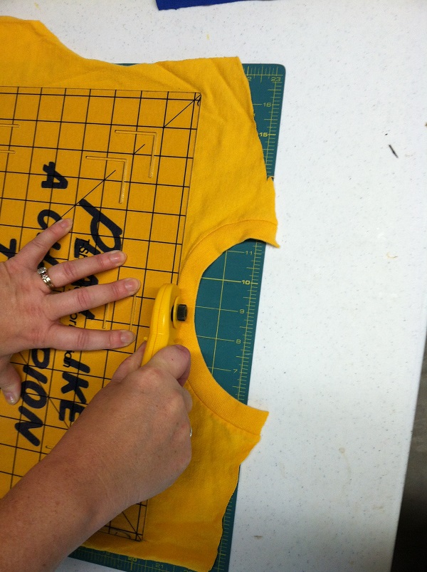 Step #1: Cut up along each side of the t-shirt, around the armhole, and across the shoulders, separating the front from the back, and also cut off the sleeves.