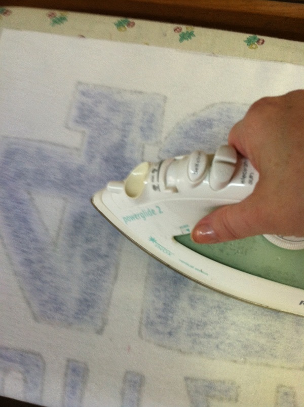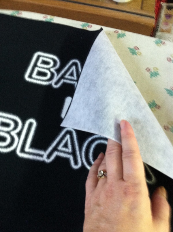 The interfacing is cut the same size as the t-shirt blocks. Then they are adhered to the back of each t-shirt block. The “rough” side of the interfacing is the side with the ‘adhesive glue.’ Therefore, place the rough side of the interfacing to the wrong side of the t-shirt block. Use a pressing cloth (placed over the interfacing), press to adhere it to the t-shirt fabric following the manufacturer’s instructions. NEVER press directly over the imprint of the t-shirt…the ink from the imprint will melt and adhere to your iron! ALWAYS use a pressing cloth OVER the area where you iron. Preferably, you should place your t-shirt block face down on the ironing board, with the interfacing piece placed (glue side down) onto the back of the t-shirt block. Then place the pressing cloth on top and iron.