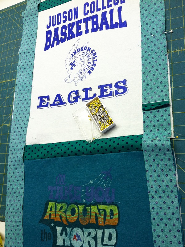 Now sew each row of t-shirt blocks one to another (top to bottom) with the sashing fabric you’ve cut out. This connects each block one to the other in rows. Once each of those long rows has been sewn together, then measure that entire row from top to bottom (60″ for example) and sew a 2-1/2″ x 60″ strip onto each side of that long row of blocks.