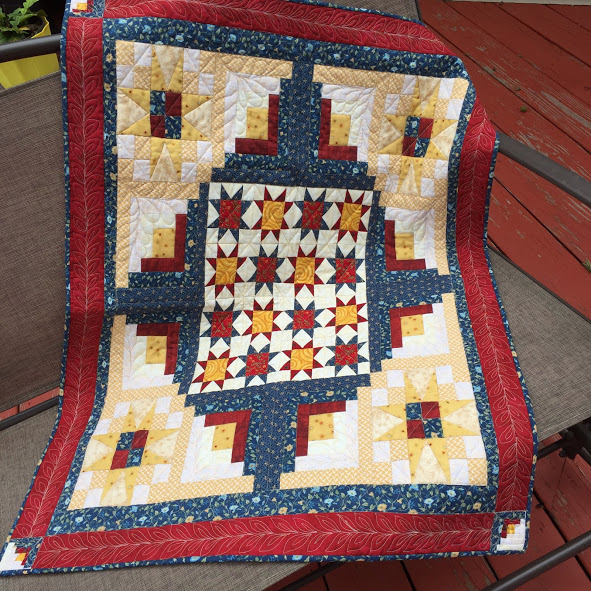 In the month of June, I’d been working on a Log Cabin quilt to enter into a contest. The quilt has the July 4th theme of colors. It is my own pattern design with stars surrounding log cabin blocks, which then surround additional stars. It has a scrappy look to it, which I adore! You know me, the scrappier the better! Well, as things normally go, the deadline for the contest was drawing near. There were many projects with deadlines that I was trying to methodically complete based on their due dates. By the time I got to the Log Cabin quilt, I was having some painful back issues…herniated disks years ago which haunt me every few months!  I persisted in working on piecing the quilt together and then getting that little quilt onto the quilt frame to be quilted.