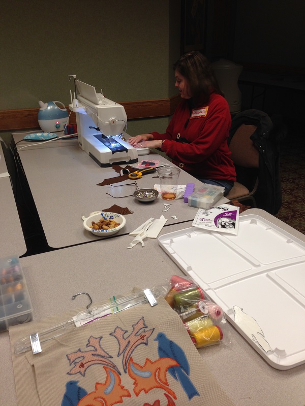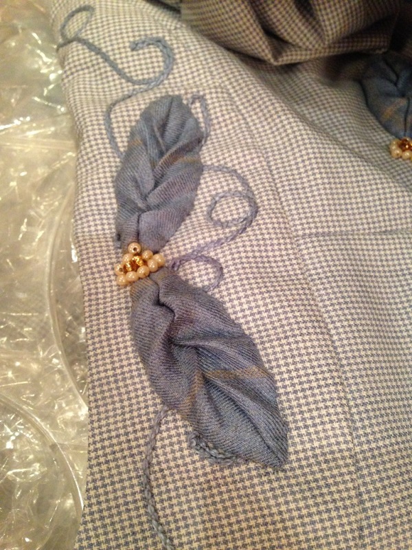 In the picture above, Jeanette has created a beautiful applique on a wool jacket. She used a periwinkle wool for the leaves, along with couching yard (for the stems) and applying beads. She demonstrated how she created these wonderful applique leaves during our ASG Retreat held in January for our Guild. She found the technique in a Threads magazine. Jeanette is always teaching and inspiring me to try new things… new ideas… new techniques! I will get a pic of the entire jacket and place it on here… you will love it!