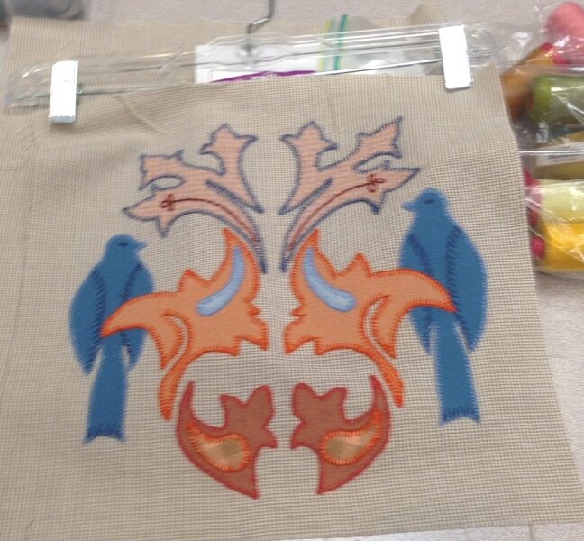 At that same ASG Retreat, Jeanette began work on wool applique blocks for a quilt. She used felted wool (she has an wonderful stash of felted wool! You can often find her looking through the racks at thrift stores for 100%-Wool garments; buying them to take home and throw in the washer & dryer so they become felted!) She used gorgeous shades of embroidery thread to machine applique each piece onto the quilt square. Here’s a close up of the block…