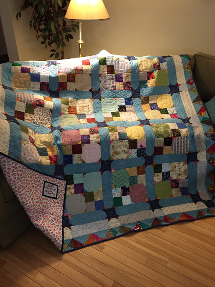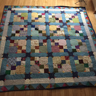 Your quilt top is finished! I would love to see the color options that you chose! Here are a couple photos of mine using my Speedy Solutions Scrap Stash and medium blue and navy blue yardage.