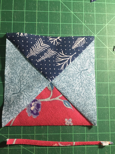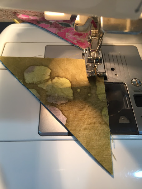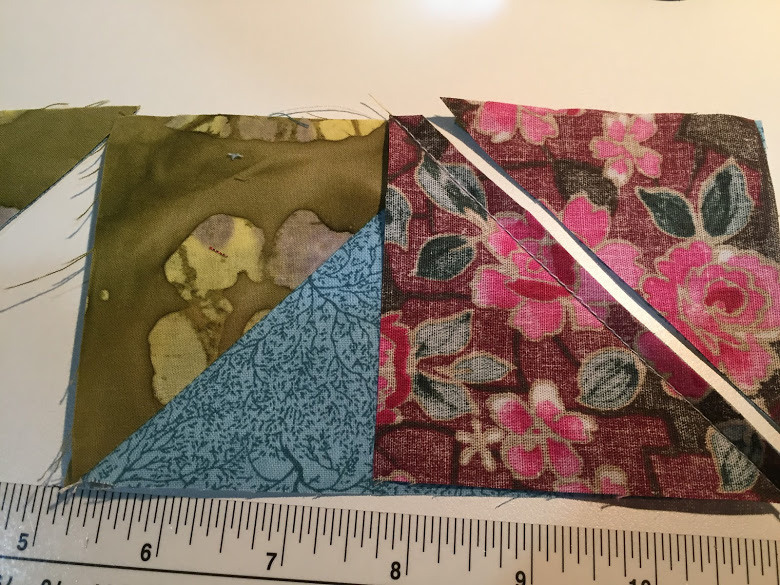 5. In the photo below, you will see the trimmed-away triangle pieces (from the FGU’s) being sewn together to create the two halves of the QST units. The light/medium blue fabric is not visible in the photo because it is underneath the green and the floral triangles as they are being stitched. Each time I sewed an FGU, I immediately created the QST unit using the trimmed away parts.