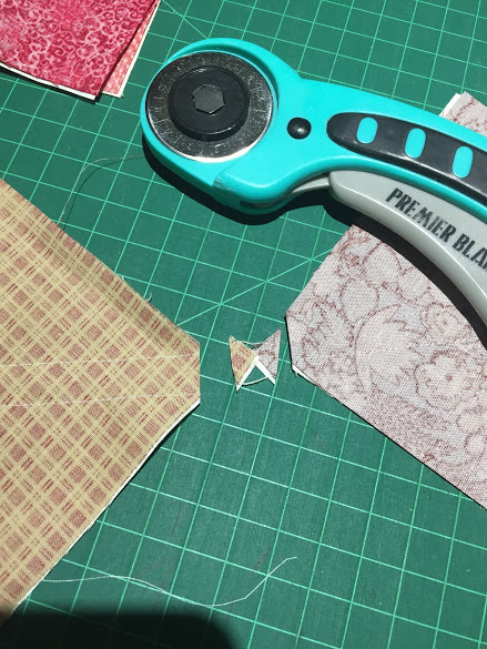 As I cut my assembly of HST’s apart, I like to trim off the “bunny ears” to get rid of that extra fabric. (see photo below)