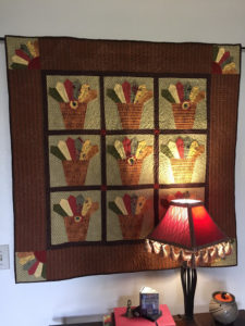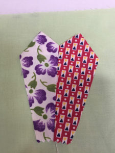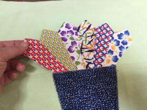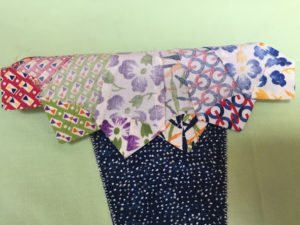 You’ll notice in the pictures that follow that I sewed six blades together to create a flower pot. The pot was appliqued to the 15″ block using a blanket stitch. The blades have not yet been stitched down… I wanted to show you how they were seamed together on the back. The blades will be appliqued to the block to complete the flower pot blocks.